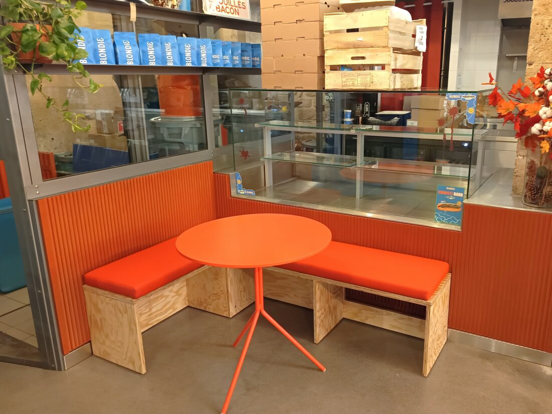 • les banquettes et mange debout en contreplaqué résineux et sellerie en similicuir,