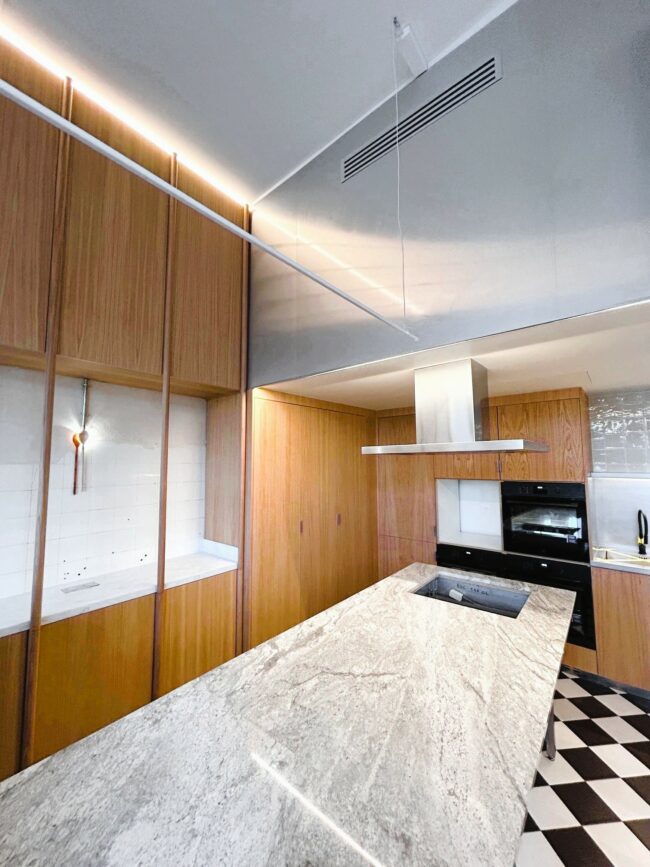 Rénovation d’un appartement au cœur de la capitale. Réalisation de l’agencement intérieur (cuisine, salon, sdb,..) avec de beaux matériaux…